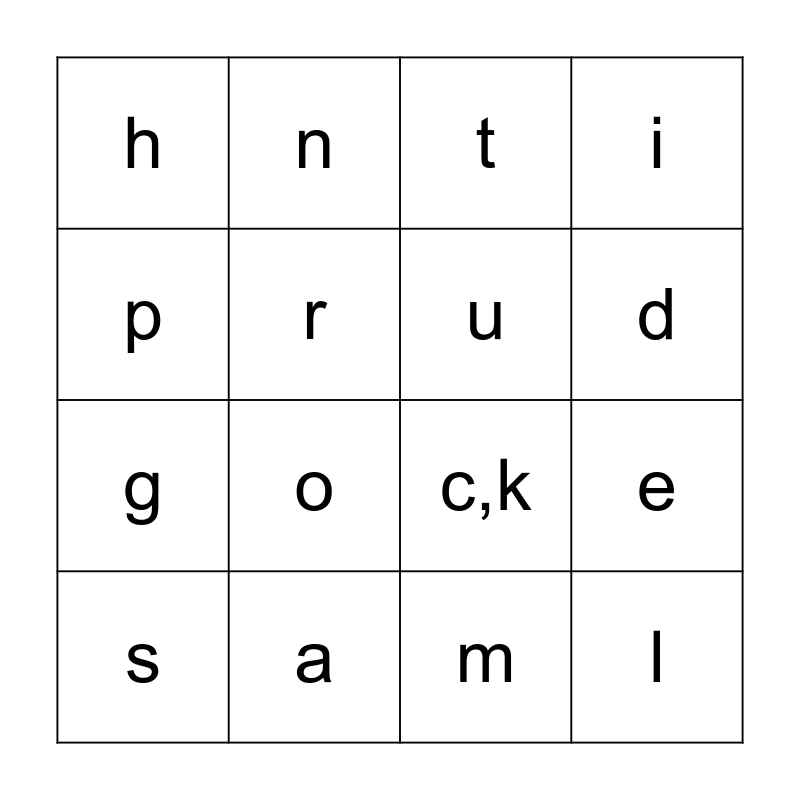 This bingo card has 16 words: s, a, t, i, p, n, c,k, e, h, r, m, d, g, o, u and l.