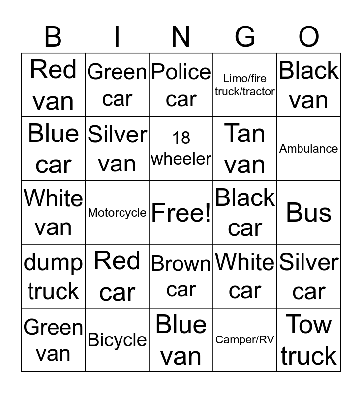 This bingo card has a free space and 25 words: Red car, Blue van, 18 wheeler, Green van, Black van, Red van, Blue car, Green car, Black car, Brown car, Tan van, White van, White car, Silver car, Silver van, Taxi, Bus, Police car, Ambulance, Motorcycle, Tow truck, Bicycle, dump truck, Limo/fire truck/tractor and Camper/RV.