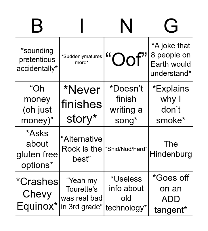 This bingo card has 19 words: “Shid/Nud/Fard”, “Mate”, “Oof”, *Goes off on an ADD tangent*, The Hindenburg, “Oh money (oh just money)”, *Useless info about old technology*, *sounding pretentious accidentally*, *Suddenlymatures more*, *Asks about gluten free options*, “Alternative Rock is the best”, *Never finishes story*, *Doesn’t finish writing a song*, “Yeah my Tourette’s was real bad in 3rd grade”, *Crashes Chevy Equinox*, “My dad is infinitely cooler than I am”, *A joke that 8 people on Earth would understand*, *Explains why I don’t smoke* and *Falls asleep at 3 AM*.