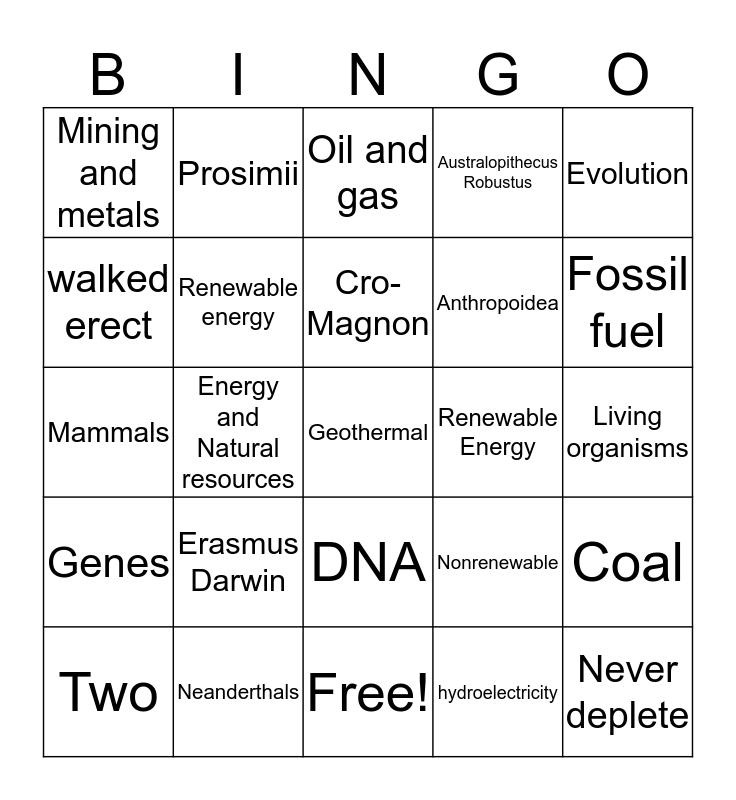This bingo card has 31 words: Free!, Chemicals, Energy and Natural resources, Forestry, Mining and metals, Oil and gas, Renewable energy, Nonrenewable, Renewable Energy, hydroelectricity, Living organisms, Geothermal, Never deplete, Iron, Fossil fuel, Nuclear, Coal, Erasmus Darwin, Genes, DNA, Evolution, Natural selection, Two, Prosimii, Anthropoidea, walked erect, Australopithecus Robustus, Mammals, Neanderthals, Cro-Magnon and The Bering Strait.