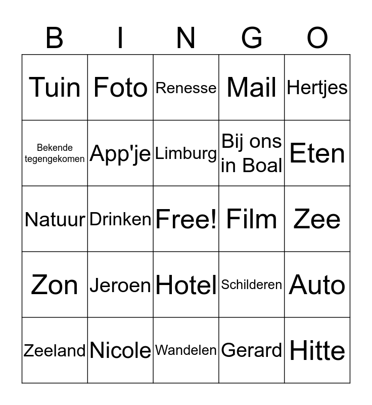 This bingo card has a free space and 24 words: Jeroen, Nicole, Limburg, Zeeland, Hertjes, Tuin, Bekende tegengekomen, Foto, Film, Hotel, Bij ons in Boal, Natuur, Schilderen, Auto, App'je, Gerard, Zee, Renesse, Eten, Drinken, Hitte, Zon, Mail and Wandelen.