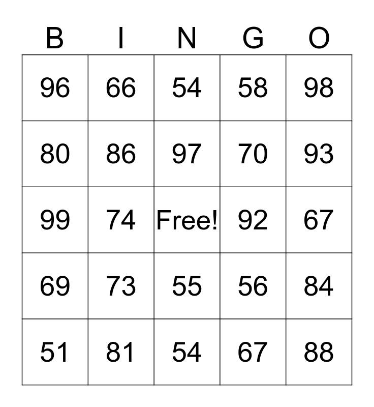 This bingo card has a free space and 29 words: 51, 63, 74, 85, 96, 54, 86, 73, 92, 81, 67, 88, 54, 67, 93, 82, 55, 69, 98, 99, 56, 60, 70, 80, 58, 66, 84, 97 and 71.