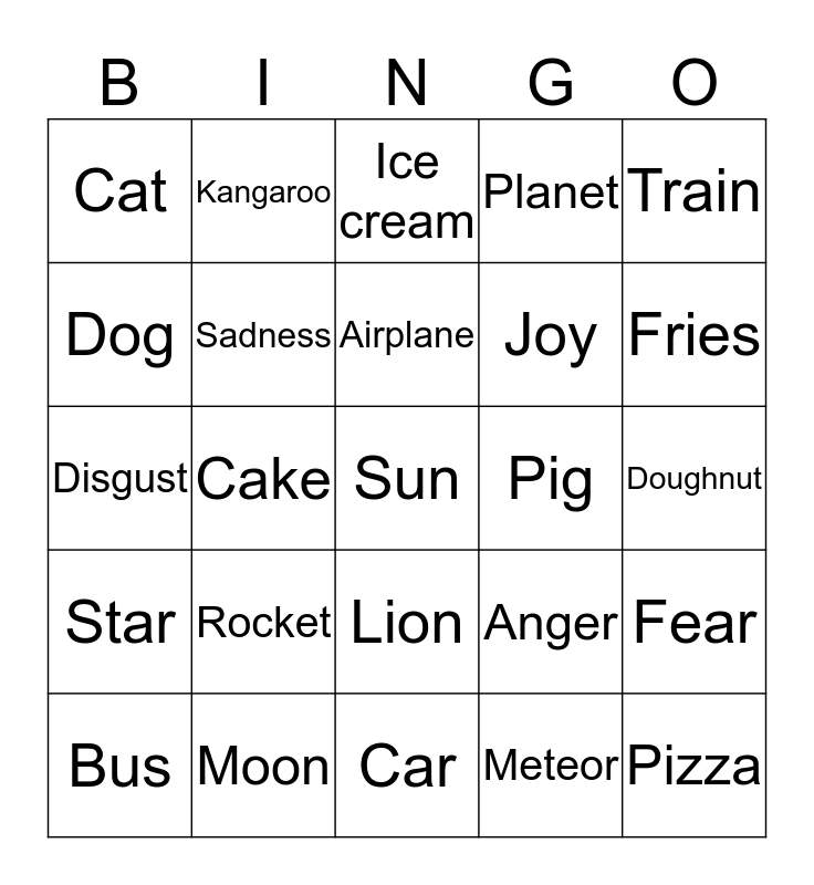 This bingo card has 25 words: Rocket, Car, Airplane, Bus, Train, Cat, Dog, Kangaroo, Pig, Lion, Joy, Disgust, Anger, Fear, Sadness, Pizza, Doughnut, Ice cream, Fries, Cake, Sun, Moon, Star, Planet and Meteor.