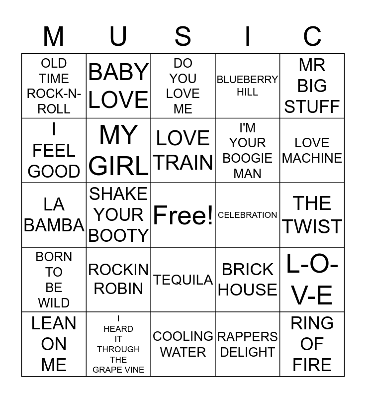 This bingo card has a free space and 27 words: BRICK HOUSE, CAR WASH, I'M YOUR BOOGIE MAN, COOLING WATER, I FEEL GOOD, DO YOU LOVE ME, BABY LOVE, BORN TO BE WILD, CELEBRATION, L-O-V-E, LA BAMBA, BLUEBERRY HILL, LEAN ON ME, I HEARD IT THROUGH THE GRAPE VINE, LOVE MACHINE, HOUND DOG, MY GIRL, LOVE TRAIN, ROCKIN ROBIN, OLD TIME ROCK-N-ROLL, THE TWIST, RAPPERS DELIGHT, SHAKE YOUR BOOTY, RING OF FIRE, TEQUILA, MR BIG STUFF and Y.M.C.A..