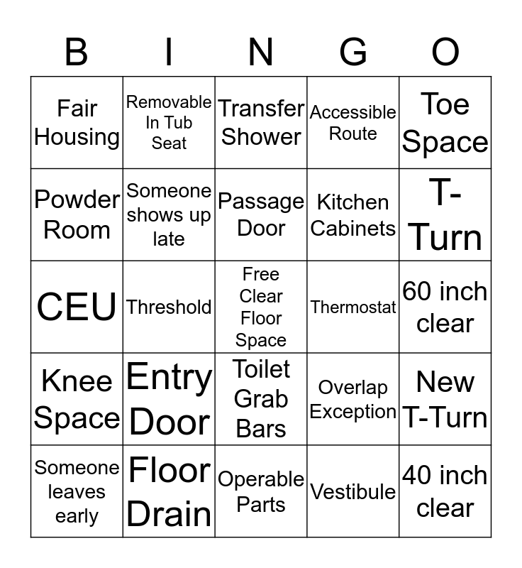 This bingo card has a free space and 39 words: Someone falls asleep, "Good Question", Natalie has to look in binder, Someone shows up late, Someone leaves early, Toilet Grab Bars, Passage Door, Reach Range, Toe Space, Knee Space, Threshold, Accessible Route, 40 inch clear, 60 inch clear, Thermostat, Entry Door, ICC A117.1 Type B, Fair Housing, Removable sink base, Overlap Exception, Powder Room, Operable Parts, Kitchen Cabinets, T-Turn, Vertical Grab Bar, Overlap, Reinforce- ment, Vertical Grab Bar, Control Area, Removable In Tub Seat, Beveled, Alternate Roll In Shower, Transfer Shower, Floor Drain, Vestibule, Toe Clearance, New T-Turn, CEU and ICC A117.1 Type C.