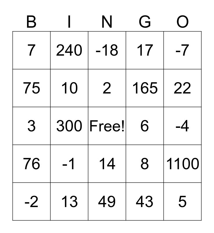 This bingo card has a free space and 24 words: -1, 13, 2, -2, -7, 7, 75, 240, 6, 14, 165, 3, 8, 1100, 10, 43, -4, -18, 22, 300, 5, 76, 17 and 49.