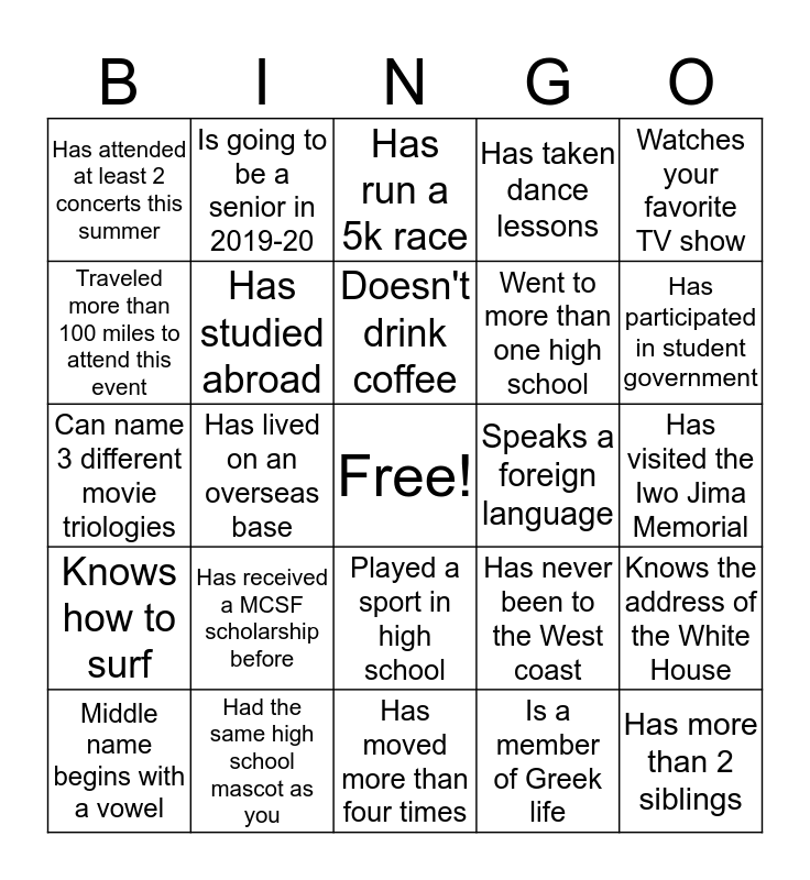 This bingo card has a free space and 40 words: Has been to the Marine Corps Museum in Quantico, Can name 3 different movie triologies, Knows the Marine Corps Birthday, Has studied abroad, Had the same high school mascot as you, Played a sport in high school, Doesn't drink coffee, Has a celebrity autograph, Watches your favorite TV show, Knows how to surf, Has lived on an overseas base, Has taken dance lessons, Has more than 2 siblings, Has visited the Iwo Jima Memorial, Speaks a foreign language, Has received a MCSF scholarship before, Has the same major as you, Has attended at least 2 concerts this summer, Has never been to D.C. before, Has run a 5k race, Knows the address of the White House, Is a member of Greek life, Went to more than one high school, Traveled more than 100 miles to attend this event, Is going to be a freshman in 2019-20, Has been a summer camp councelor, Has been on TV/News, Plays a musical instrument, Was born after their parent served in the Marine Corps or Navy, Is left handed, Knows the entire military alphabet, Middle name begins with a vowel, Has the same birthday month as you, Has never been to the West coast, Has participated in student government, Has moved more than four times, Parent is still active duty, Has a sibling who received a MCSF scholarship before, Is going to be a senior in 2019-20 and Knows what Semper Fidelis means.