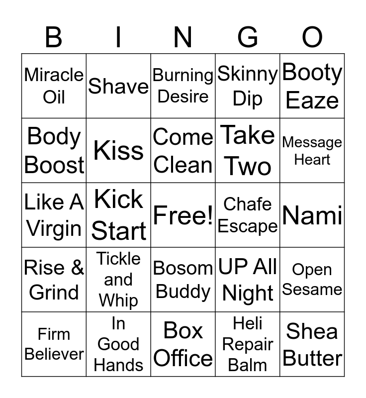 This bingo card has a free space and 35 words: Coochy, Body Dew, Aftershave, Kiss, Bosom Buddy, Skinny Dip, Body Boost, Just Like Me, Come Clean, CocoGlow, Like A Virgin, Booty Eaze, Whipped, O, Miracle Oil, Chafe Escape, Heli Repair Balm, Kick Start, Rise & Grind, Shea Butter, UP All Night, Firm Believer, Open Sesame, In Good Hands, Burning Desire, Message Heart, Between The Sheets, Bombshell, Take Two, Nami, Woke Up Like This, Box Office, Tickle and Whip, Shave and Dark Temptation.