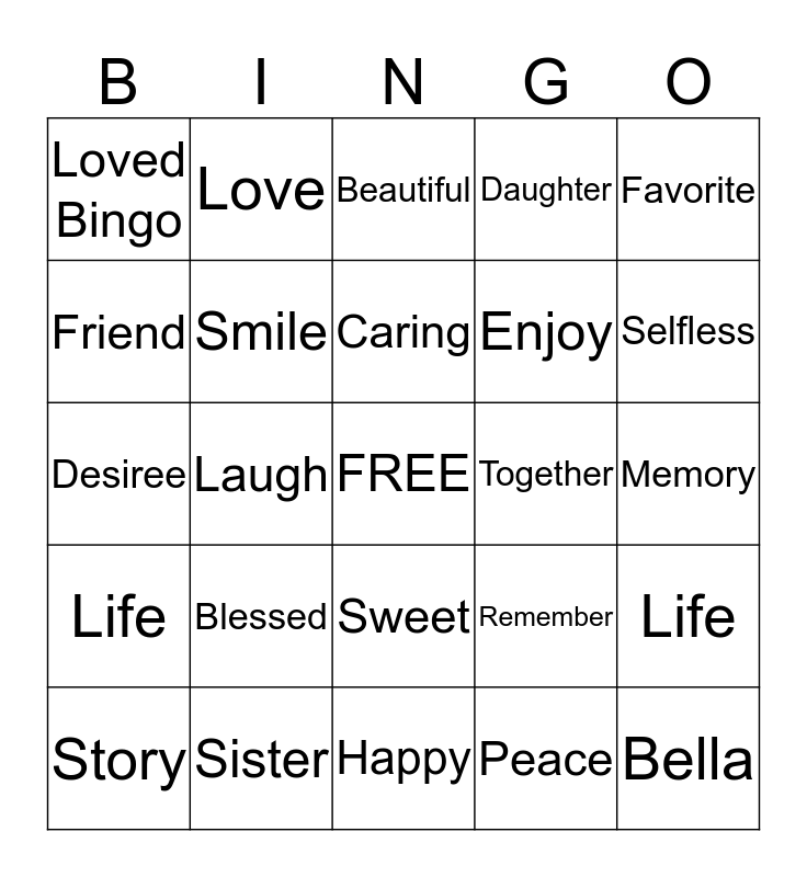 This bingo card has a free space and 30 words: Sister, Passionate, Laugh, Kind, Loved Bingo, Beautiful, Smile, Sweet, Together, Happy, Memory, Bella, Peace, Family, Selfless, Favorite, Remember, Life, Blessed, Favorite, Desiree, Spirit, Love, Enjoy, Friend, Daughter, Life, Story, Caring and Love.