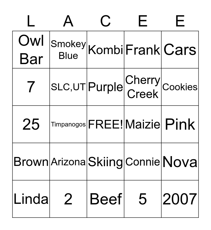 This bingo card has a free space and 24 words: Arizona, 2, Purple, Linda, Cars, Owl Bar, 7, Smokey Blue, Maizie, Skiing, Cherry Creek, 25, Connie, Nova, SLC,UT, 5, Pink, Kombi, Cookies, Timpanogos, 2007, Brown, Frank and Beef.