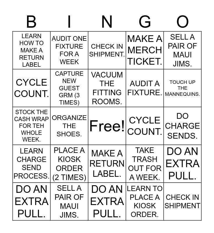 This bingo card has a free space and 24 words: DO AN EXTRA PULL., PLACE A KIOSK ORDER (2 TIMES), VACUUM THE FITTING ROOMS., LEARN TO PLACE A KIOSK ORDER., SELL A PAIR OF MAUI JIMS., LEARN HOW TO MAKE A RETURN LABEL, AUDIT ONE FIXTURE FOR A WEEK, CHECK IN SHIPMENT., CYCLE COUNT., DO CHARGE SENDS., STOCK THE CASH WRAP FOR TEH WHOLE WEEK., CAPTURE NEW GUEST GRM (3 TIMES), TAKE TRASH OUT FOR A WEEK., DO AN EXTRA PULL., CYCLE COUNT., SELL A PAIR OF MAUI JIMS., DO AN EXTRA PULL., MAKE A MERCH TICKET., TOUCH UP THE MANNEQUINS., LEARN CHARGE SEND PROCESS., ORGANIZE THE SHOES., MAKE A RETURN LABEL., AUDIT A FIXTURE. and CHECK IN SHIPMENT.