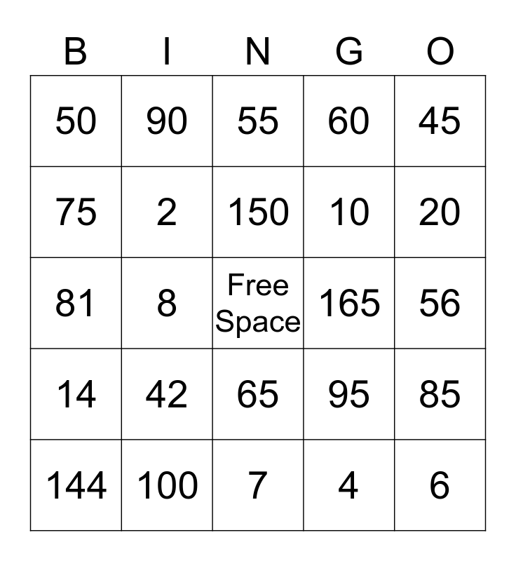 This bingo card has a free space and 24 words: 42, 100, 150, 144, 45, 50, 75, 90, 165, 65, 10, 81, 95, 85, 2, 4, 56, 55, 20, 8, 6, 14, 60 and 7.