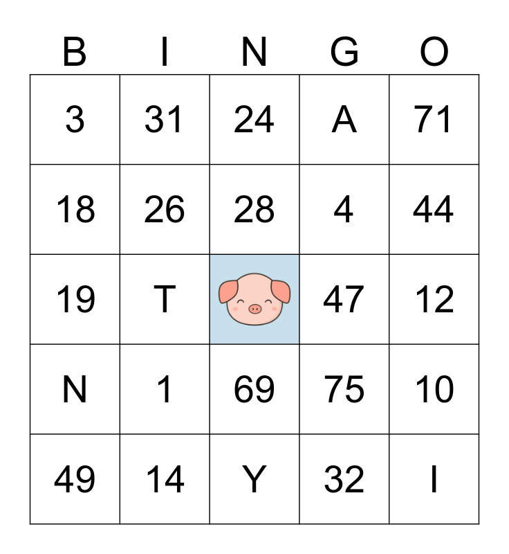 This bingo card has a free space and 24 words: 1, 14, 28, 49, 71, 3, 18, 31, 47, 69, 4, 19, 75, 10, 26, 32, 12, 24, 44, T, I, N, A and Y.