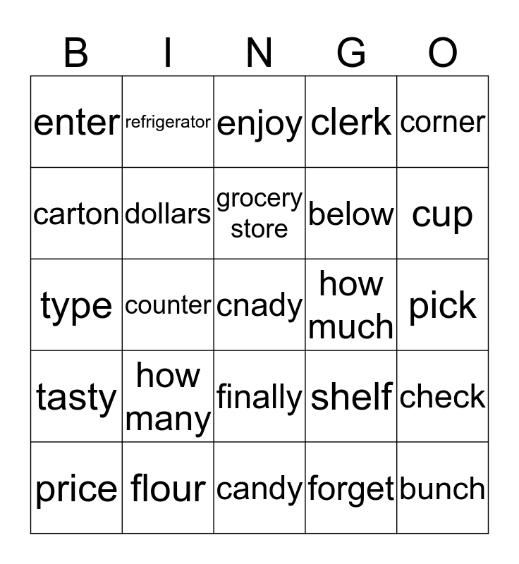 This bingo card has a free space and 26 words: finally, forget, grocery store, flour, corner, enter, carton, refrigerator, pick, shelf, below, type, check, price, counter, excuse me, clerk, tasty, enjoy, bunch, cup, candy, how much, how many, dollars and bowl.