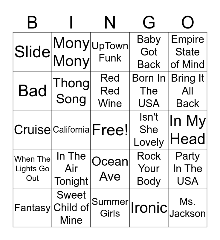 This bingo card has a free space and 24 words: In The Air Tonight, Sweet Child of Mine, Red Red Wine, Fantasy, Empire State of Mind, Slide, Bad, Mony Mony, Isn't She Lovely, Ocean Ave, Born In The USA, Cruise, Rock Your Body, Party In The USA, Thong Song, Ironic, In My Head, UpTown Funk, Bring It All Back, California, Ms. Jackson, When The Lights Go Out, Baby Got Back and Summer Girls.
