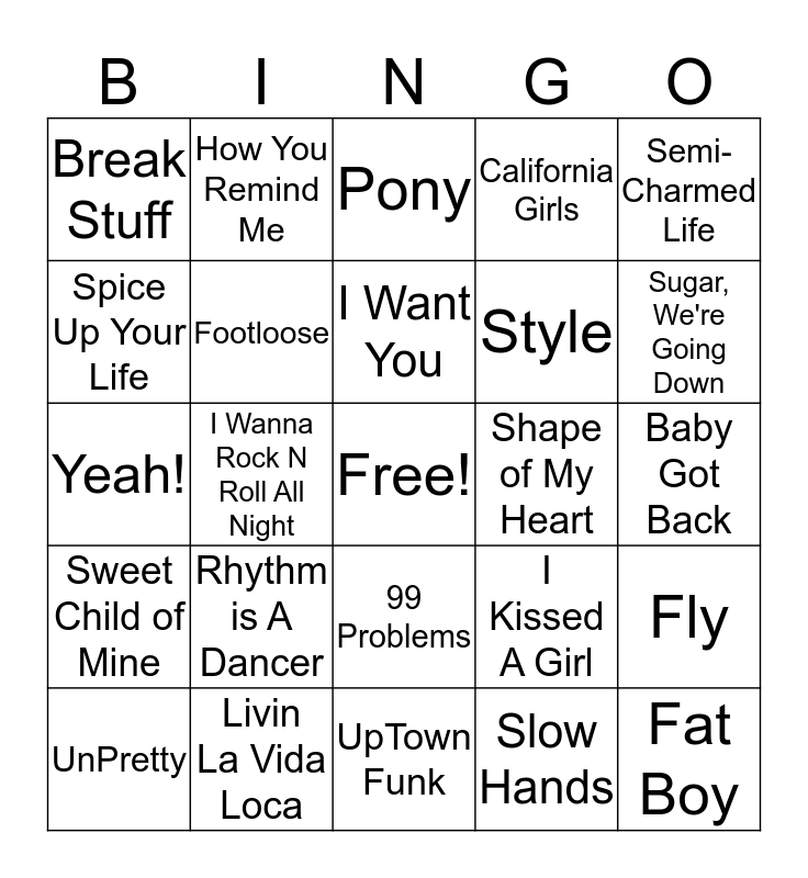 This bingo card has a free space and 24 words: Rhythm is A Dancer, Livin La Vida Loca, I Want You, UnPretty, Semi-Charmed Life, Break Stuff, Spice Up Your Life, How You Remind Me, Shape of My Heart, 99 Problems, Style, Yeah!, I Kissed A Girl, Fly, Footloose, Slow Hands, Baby Got Back, Pony, Sugar, We're Going Down, I Wanna Rock N Roll All Night, Fat Boy, Sweet Child of Mine, California Girls and UpTown Funk.