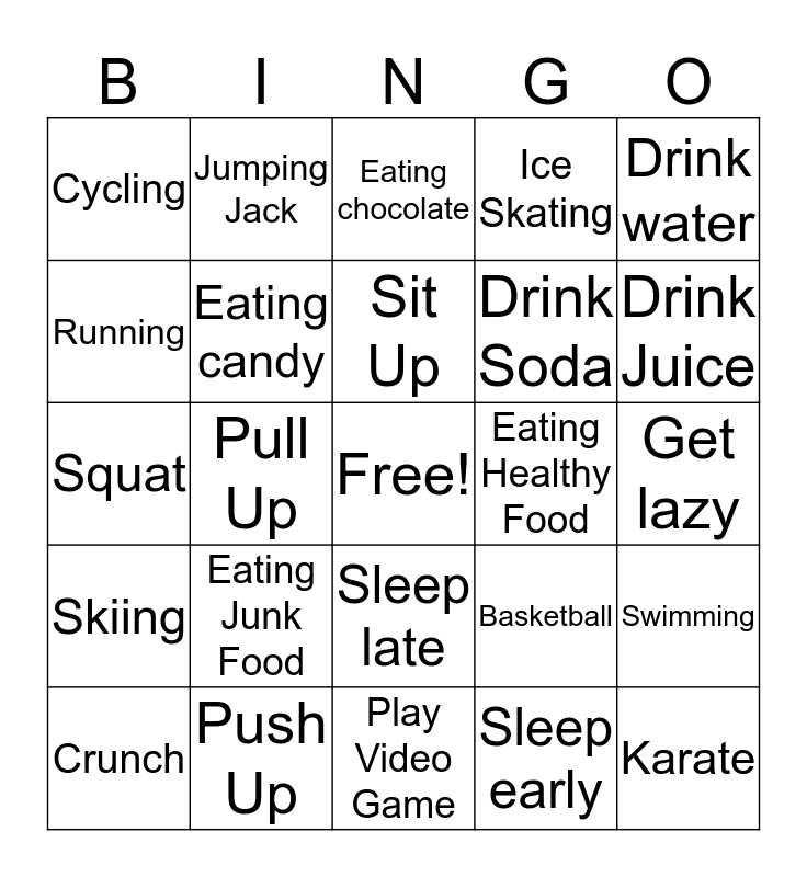 This bingo card has a free space and 24 words: Eating Junk Food, Push Up, Sit Up, Crunch, Drink water, Cycling, Running, Jumping Jack, Eating Healthy Food, Sleep late, Drink Soda, Squat, Basketball, Swimming, Eating candy, Sleep early, Get lazy, Eating chocolate, Drink Juice, Pull Up, Karate, Skiing, Ice Skating and Play Video Game.