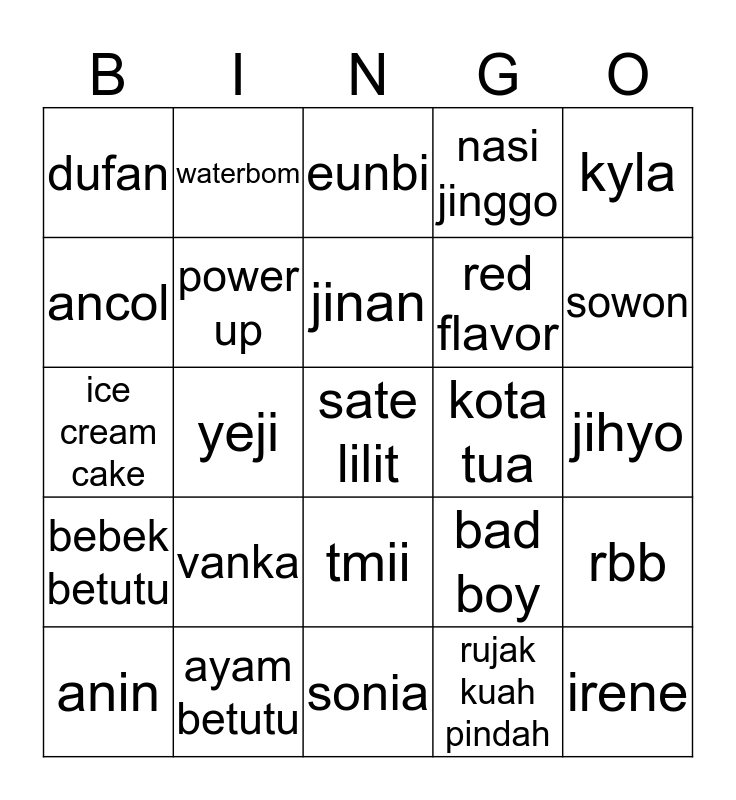 This bingo card has 25 words: vanka, sonia, jinan, anin, kyla, dufan, ancol, waterbom, kota tua, tmii, red flavor, ice cream cake, bad boy, rbb, power up, irene, jihyo, eunbi, sowon, yeji, sate lilit, ayam betutu, bebek betutu, nasi jinggo and rujak kuah pindah.