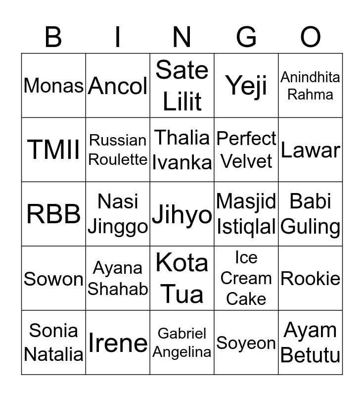 This bingo card has 25 words: Ayana Shahab, Gabriel Angelina, Thalia Ivanka, Sonia Natalia, Anindhita Rahma, Monas, TMII, Ancol, Masjid Istiqlal, Kota Tua, Perfect Velvet, RBB, Ice Cream Cake, Rookie, Russian Roulette, Ayam Betutu, Babi Guling, Sate Lilit, Lawar, Nasi Jinggo, Jihyo, Irene, Sowon, Yeji and Soyeon.