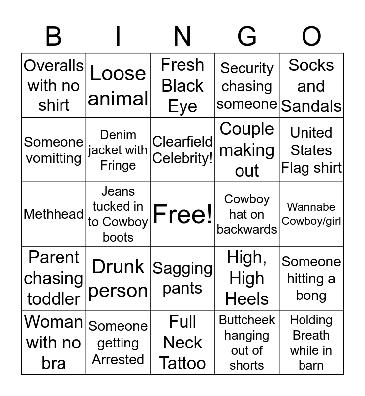 This bingo card has a free space and 29 words: Woman with no bra, Man/ woman with a mullet, Jeans tucked in to Cowboy boots, Fight, Overalls with no shirt, Fresh Black Eye, Denim jacket with Fringe, Drunk person, Cowboy hat on backwards, Someone getting Arrested, Wannabe Cowboy/girl, Holding Breath while in barn, Full Neck Tattoo, Buttcheek hanging out of shorts, United States Flag shirt, Plumber's Crack, Sagging pants, Parent chasing toddler, Socks and Sandals, Methhead, High, High Heels, Someone dressed in Drag, Couple making out, Someone vomitting, Security chasing someone, Loose animal, Someone hitting a bong, Clearfield Celebrity! and Someone loosing their food.