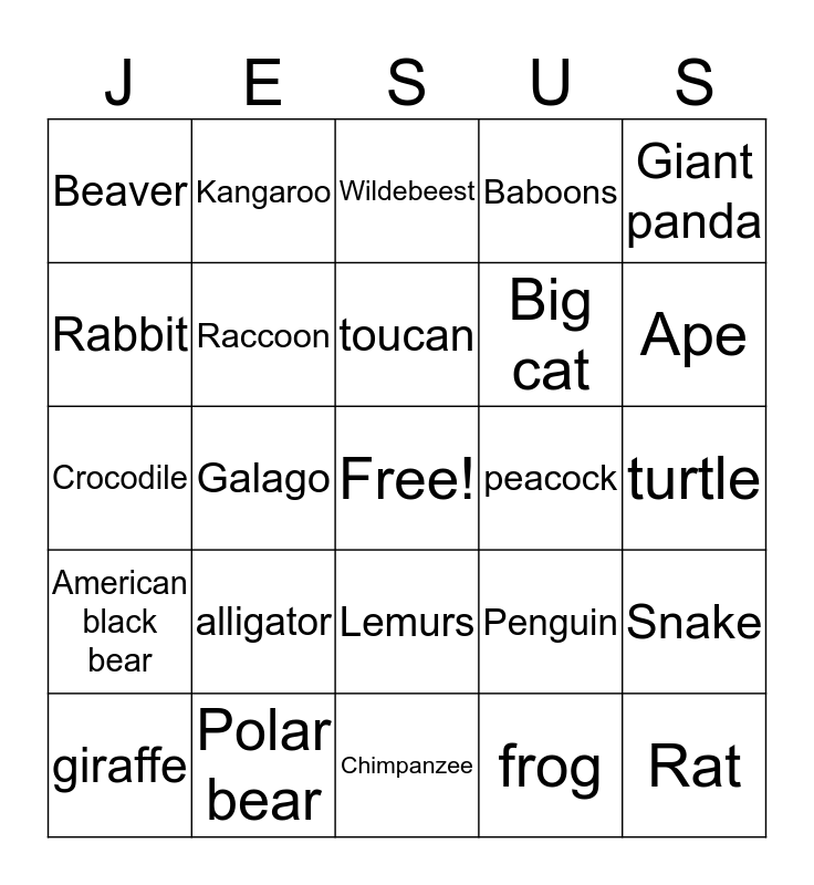 This bingo card has a free space and 24 words: giraffe, alligator, toucan, frog, Giant panda, Beaver, Kangaroo, Wildebeest, peacock, turtle, Crocodile, Raccoon, Penguin, Snake, Rabbit, Polar bear, Chimpanzee, Baboons, Ape, American black bear, Galago, Lemurs, Big cat and Rat.