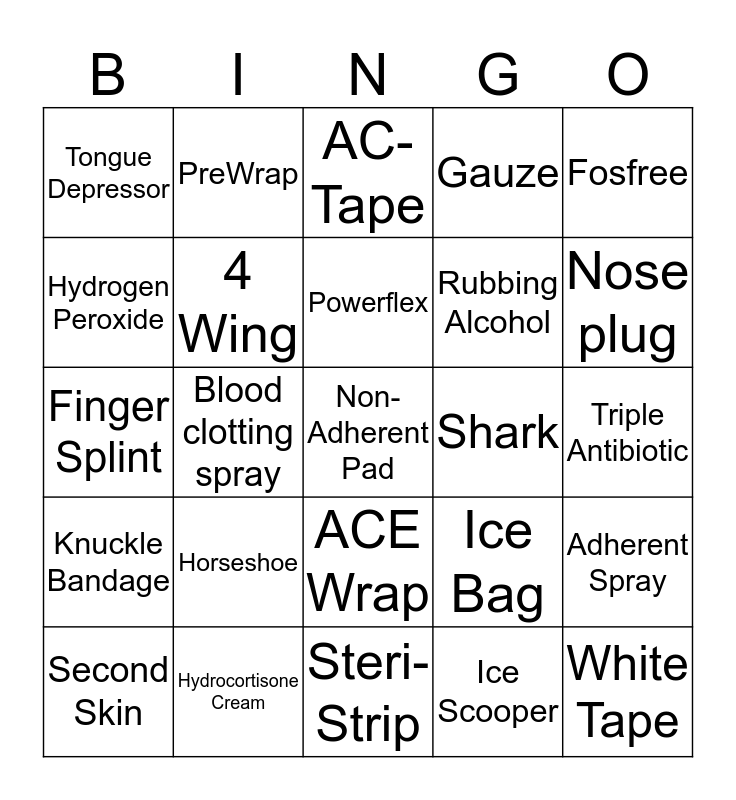 This bingo card has 32 words: Ice Scooper, Contact Solution, Blood clotting spray, Sunscreen, Knuckle Bandage, 4 Wing, Fosfree, Adherent Spray, PreWrap, White Tape, Powerflex, AC-Tape, Lightplast, Mole Skin, Shark, Stick it, Second Skin, Finger Splint, ACE Wrap, Horseshoe, Ice Bag, Flex-I-Wrap, Triple Antibiotic, Hydrocortisone Cream, Non-Adherent Pad, Gauze, Rubbing Alcohol, Hydrogen Peroxide, Tongue Depressor, Steri-Strip, Glove and Nose plug.