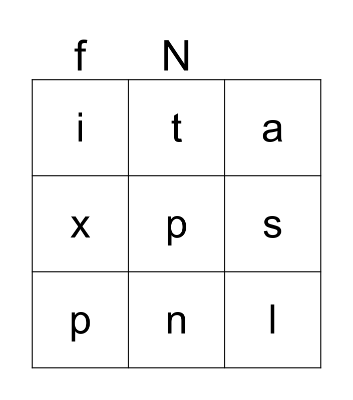 This bingo card has a free space and 8 words: s, a, t, p, i, l, x and n.