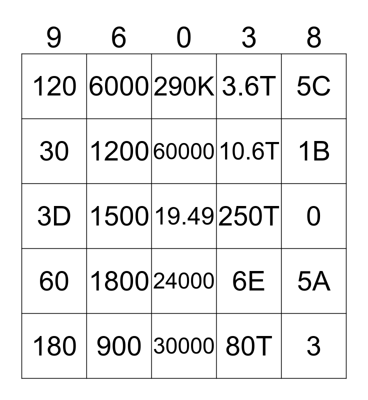 This bingo card has a free space and 109 words: 3, 210, 18000, 300K, 500T, 6, 240, 21000, 600K, 1QD, 9, 300, 900K, 3QD, 12, 600, 24000, 950K, 1A, 15, 900, 27000, 1T, 2A, 18, 1200, 30000, 1.9T, 3A, 21, 1500, 60000, 3.6T, 4A, 24, 1800, 120K, 5T, 5A, 27, 2100, 150K, 10.6T, 1B, 30, 2400, 180K, 75T, 2B, 60, 2700, 210K, 80T, 3B, 90, 3000, 240K, 90T, 4B, 120, 6000, 270K, 100T, 5B, 150, 9000, 280K, 128T, 1C, 180, 12000, 290K, 250T, 2C, 1D, 4D, 2E, 5E, 3C, 2D, 5D, 3E, 6A, 4C, 3D, 1E, 4E, 7A, 5C, 7C, 6D, 6C, 7B, 7D, 7E, 6, 5, 4, 3, 2, 1, 6B, 6E, 0, 0A, 0B, 0C, 0D and 0E.