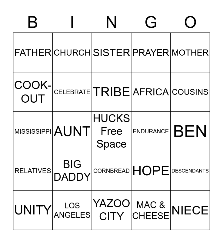 This bingo card has a free space and 74 words: ANCESTORS, BROTHER, SISTER, GENEALOGY, PARENTS, FAMILY TREE, BANQUET, REUNION, UNITY, LEGACY, HERITAGE, ROOTS, TRIBE, COOK-OUT, BBQ, AUNT, UNCLE, COUSINS, TRADITION, MISSISSIPPI, CELEBRATE, CHURCH, PRAYER, BLESSINGS, NIECE, NEPHEW, NEW ORLEANS, GATHER, LOVE, TOGETHER, MOTHER, FATHER, ST LOUIS, DETROIT, JACKSON, MAC & CHEESE, SWEET POTATO PIE, GREENS, HAM HOCKS, FRIED CHICKEN, YAZOO CITY, LOS ANGELES, WASHINGTON D.C., MEMPHIS, MOTHER, FATHER, BIG MAMA, BIG DADDY, MADEA, CHITTERLINGS, SATARTIA, PEACH COBBLER, BEN, ALETHA, GRANDMOTHER, GRANDFATHER, CORNBREAD, GENERATION, KIN FOLKS, DESCENDANTS, AFRICA, MATRIARCH, RELATIVES, PATRIARCH, ENDURANCE, INTEGRITY, HARD-WORKING, FAITH, HOPE, PROSPERITY, HONOR, MEMORIAL, TRIBUTE and DEDICATE.