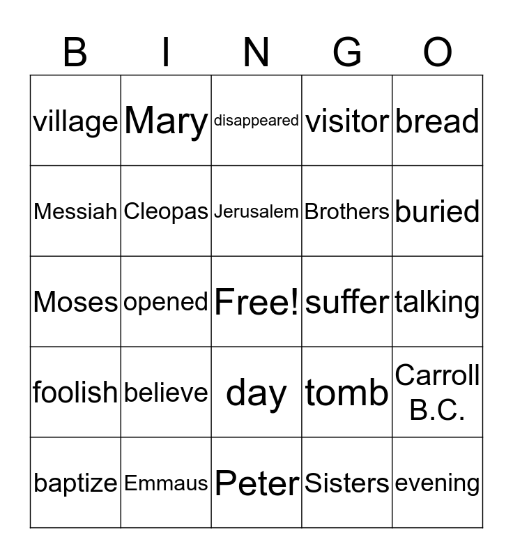 This bingo card has a free space and 40 words: walked, Moses, thanks, Cleopas, Emmaus, day, Jerusalem, Jesus, bread, foolish, opened, visitor, evening, talking, suffer, believe, prophet, village, table, disappeared, Carroll B.C., Sisters, Brothers, Messiah, scripture, God, vacation bible school, road, child, temple, river, baptize, water, tomb, buried, Peter, John, angels, Mary and rock.
