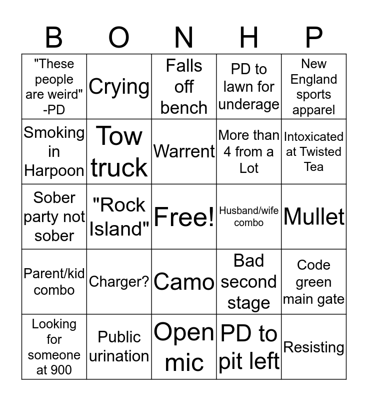 This bingo card has a free space and 28 words: Code green main gate, Clean up isle 2, More than 4 from a Lot, PD to pit left, Smoking in Harpoon, Falls off bench, Crying, Parent/kid combo, Husband/wife combo, Looking for someone at 900, Sober party not sober, PD to lawn for underage, Public urination, Open mic, Intoxicated at Twisted Tea, Women in the men's room, Charger?, Tow truck, Warrent, Camo, "These people are weird" -PD, Pepper spray, Resisting, "Rock Island", Mullet, Bad second stage, New England sports apparel and 5 cops at once in control.