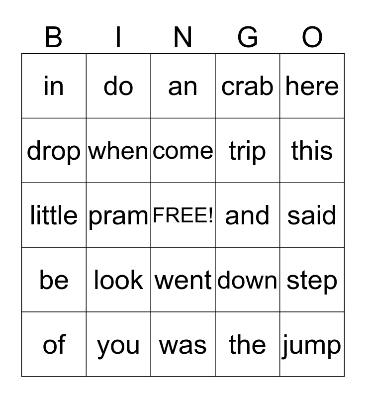 This bingo card has a free space and 34 words: here, the, have, like, be, when, here, of, do, for, come, an, to, see, and, this, you, little, look, down, went, that, in, said, was, jump, crab, stop, trip, drop, flag, pram, step and frog.