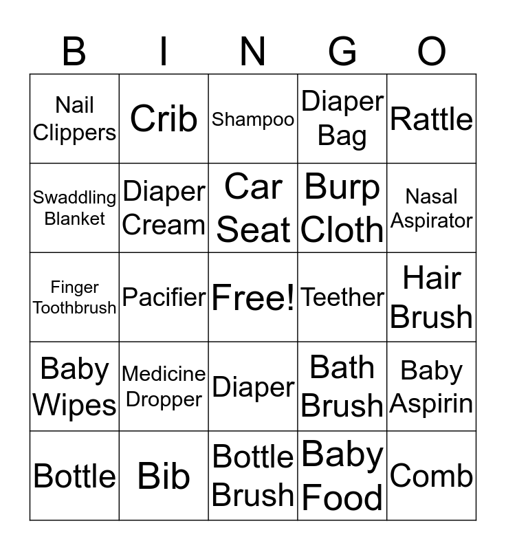 This bingo card has a free space and 29 words: Bottle, Baby Powder, Pacifier, Spoon, Nail Clippers, Shampoo, Diaper Cream, Medicine Dropper, Teether, Bib, Hair Brush, Comb, Bottle Brush, Baby Food, Nasal Aspirator, Sock, Diaper, Baby Wipes, Rattle, Finger Toothbrush, Bath Brush, Mittens, Burp Cloth, Swaddling Blanket, Diaper Bag, Crib, Baby Aspirin, Car Seat and Stroller.