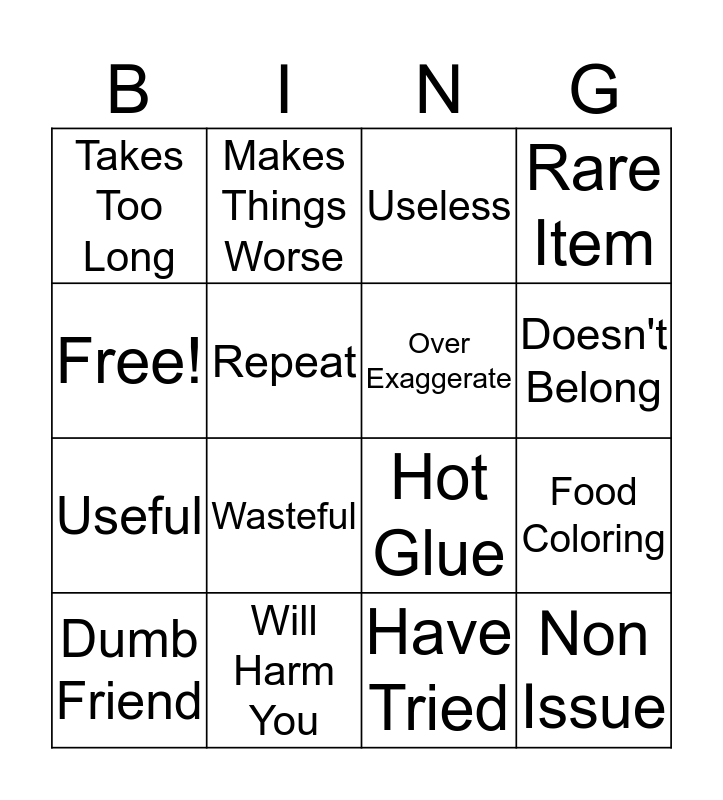 This bingo card has 16 words: Will Harm You, Food Coloring, Useless, Takes Too Long, Useful, Makes Things Worse, Hot Glue, Have Tried, Free!, Repeat, Dumb Friend, Rare Item, Wasteful, Doesn't Belong, Over Exaggerate and Non Issue.
