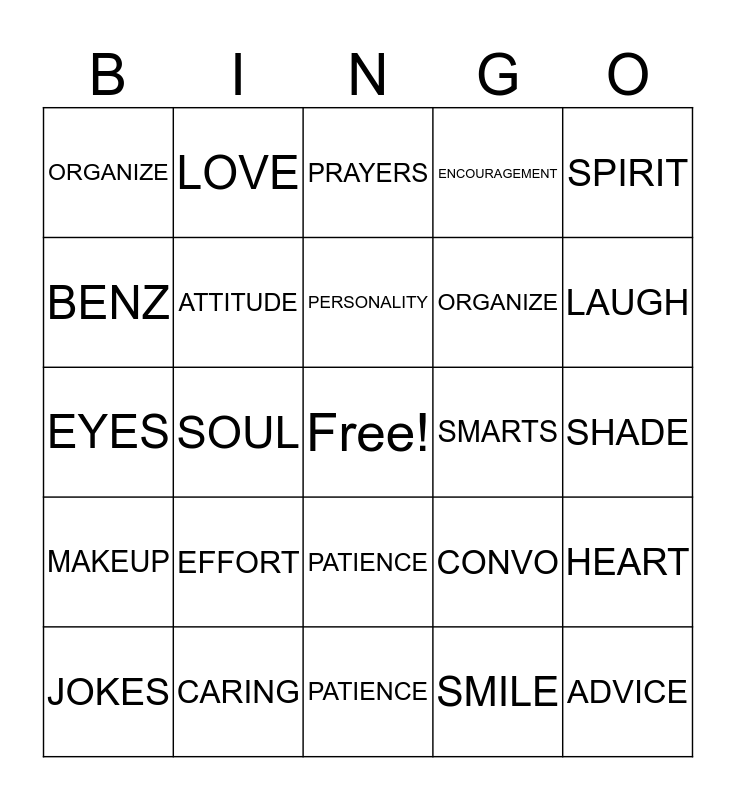 This bingo card has a free space and 29 words: JOKES, SUPPORT, SOUL, FRIEND -SHIP, ORGANIZE, PRAYERS, ATTITUDE, EFFORT, SMARTS, CARING, SHADE, ADVICE, PATIENCE, SMILE, LAUGH, BEAUTY, PATIENCE, MAKEUP, SPIRIT, EYES, CONVO, PRAYERS, ORGANIZE, BENZ, ENCOURAGEMENT, LOVE, HEART, PERSONALITY and FAITH.