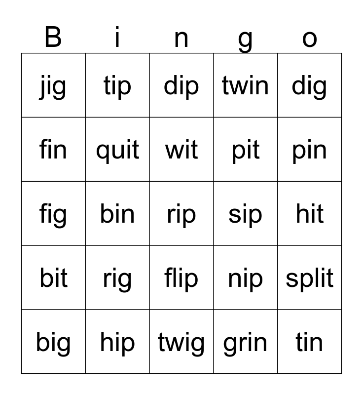 This bingo card has a free space and 29 words: big, pig, bin, fit, jig, dip, quit, rig, sip, hip, hit, tin, twig, grin, pin, chin, flip, bit, dig, fig, nip, sit, pit, fin, twin, tip, split, wit and win.