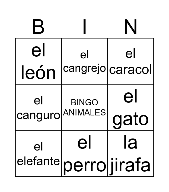 This bingo card has a free space and 11 words: la cebra, el perro, la jirafa, el elefante, el cangrejo, el caracol, el gato, el camello, el canguro, el león and la mariposa.