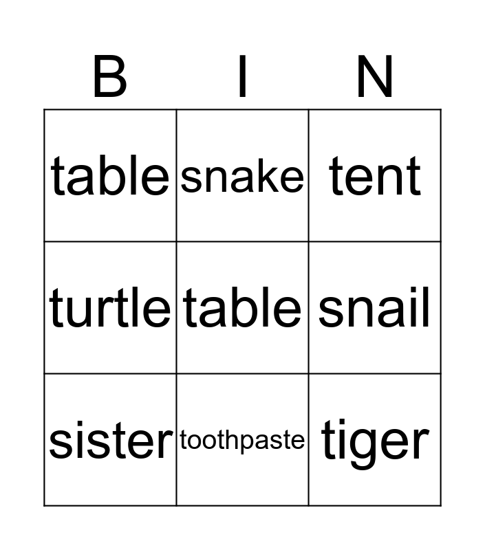 This bingo card has a free space and 12 words: ten, star, tiger, snail, snake, tent, toothpaste, school, table, turtle, sister and toes.