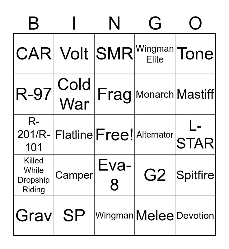 This bingo card has a free space and 24 words: Camper, SP, Frag, Grav, Tone, CAR, R-97, Volt, Alternator, Eva-8, Monarch, R-201/R-101, G2, Spitfire, Cold War, Melee, L-STAR, SMR, Mastiff, Flatline, Devotion, Killed While Dropship Riding, Wingman Elite and Wingman.