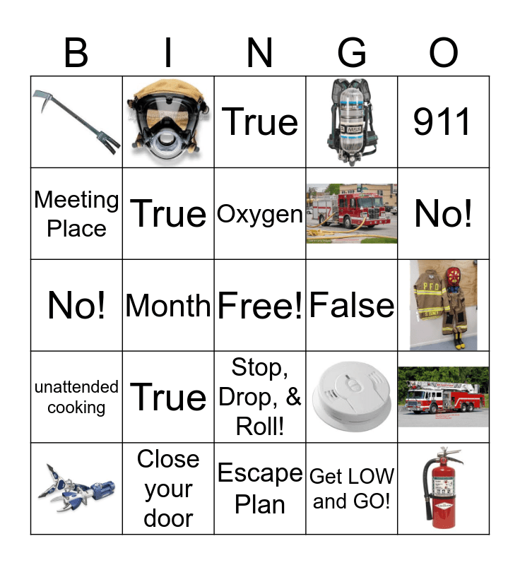 This bingo card has 9 images, a free space and 15 words: True, Close your door, Oxygen, 911, Meeting Place, False, Stop, Drop, & Roll!, No!, True, Get LOW and GO!, True, No!, Month, unattended cooking and Escape Plan.