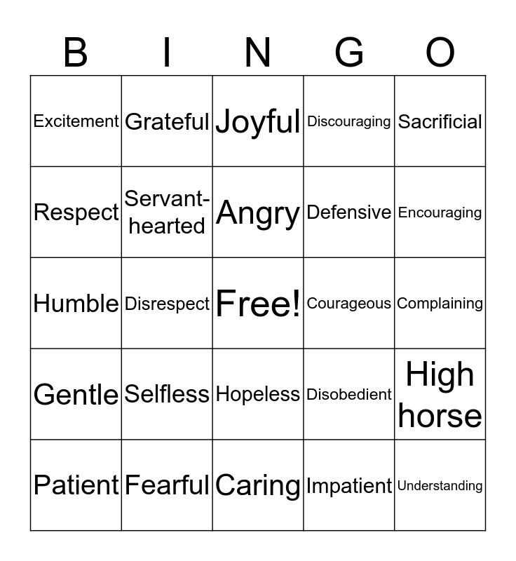 This bingo card has a free space and 34 words: Kind, Impatient, Proud, Rude, Gentle, Servant-hearted, Sacrificial, Patient, Grateful, Hopeless, Angry, Joyful, Innocent, Obedient, Courageous, Encouraging, Fearful, Humble, Selfless, Disobedient, Hopeless, Loving, Excitement, Complaining, Caring, Understanding, Discouraging, Temper, Defensive, Respect, Tolerance, Disrespect, High horse and Reverence.
