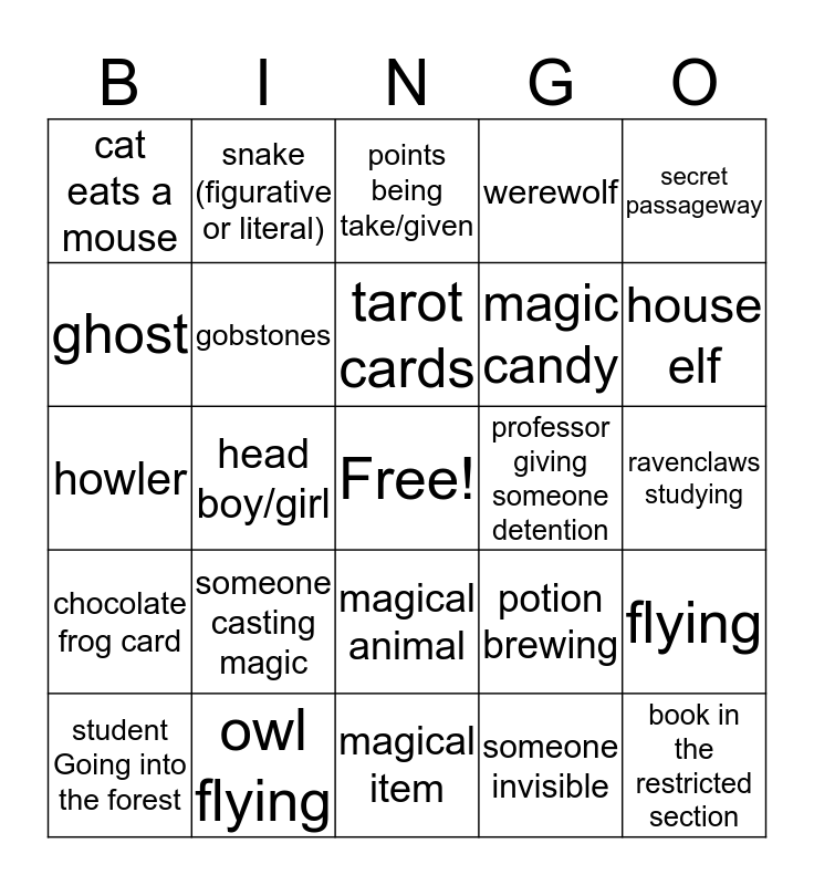 This bingo card has a free space and 24 words: someone casting magic, owl flying, tarot cards, student Going into the forest, secret passageway, cat eats a mouse, ghost, snake (figurative or literal), professor giving someone detention, magical animal, magic candy, howler, potion brewing, flying, gobstones, someone invisible, ravenclaws studying, points being take/given, house elf, head boy/girl, book in the restricted section, chocolate frog card, werewolf and magical item.