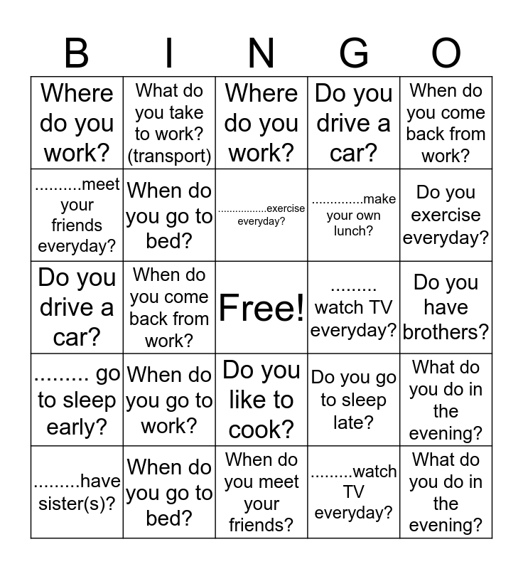 This bingo card has a free space and 24 words: When do you go to work?, When do you go to bed?, .................exercise everyday?, .........have sister(s)?, When do you come back from work?, Where do you work?, ..........meet your friends everyday?, What do you take to work? (transport), ......... watch TV everyday?, Do you like to cook?, ..............make your own lunch?, Do you drive a car?, Do you go to sleep late?, What do you do in the evening?, When do you go to bed?, .........watch TV everyday?, Do you have brothers?, Where do you work?, Do you exercise everyday?, When do you come back from work?, What do you do in the evening?, ......... go to sleep early?, Do you drive a car? and When do you meet your friends?.