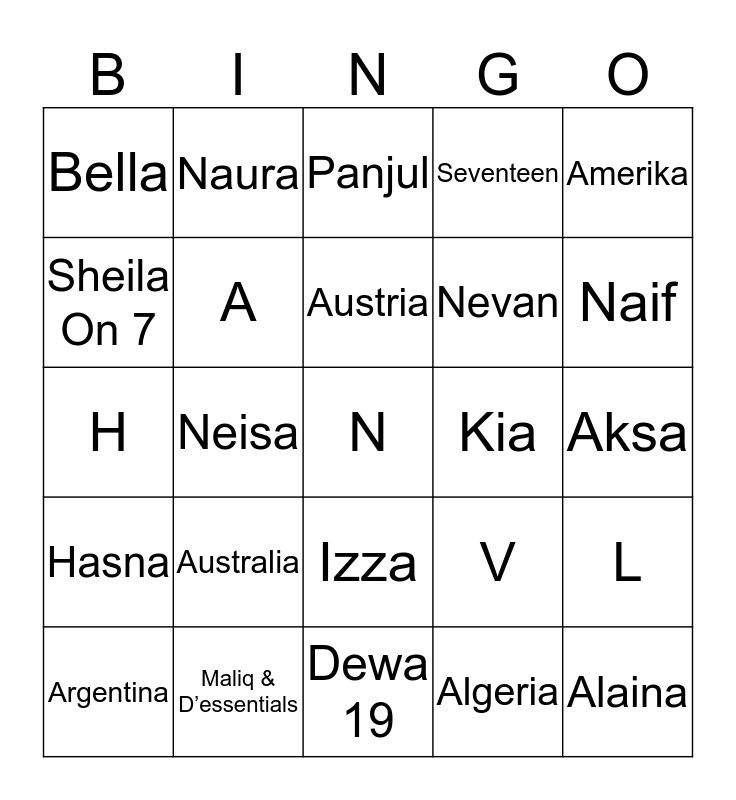 This bingo card has a free space and 24 words: Argentina, Australia, Austria, Algeria, Amerika, Bella, Naura, Panjul, Kia, Aksa, H, A, V, L, Sheila On 7, Maliq & D’essentials, Dewa 19, Seventeen, Naif, Hasna, Neisa, Izza, Nevan and Alaina.