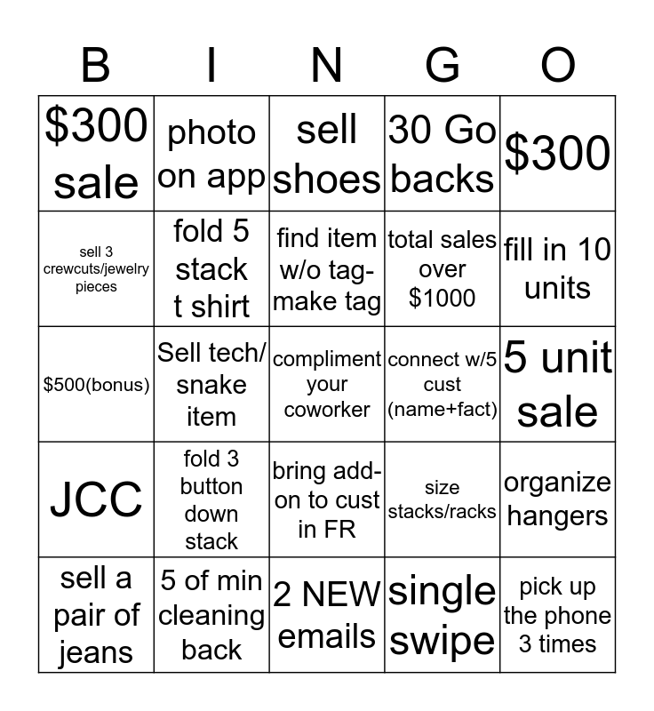 This bingo card has a free space and 29 words: sell a pair of jeans, JCC, Sell tech/ snake item, $200 sale, $300 sale, sell shoes, fold 5 stack t shirt, fold 3 button down stack, connect w/5 cust (name+fact), 5 of min cleaning back, 5 unit sale, pick up the phone 3 times, 2 NEW emails, single swipe, fill in 10 units, start 8 fitting rooms, bring add-on to cust in FR, JCC, $300, $500(bonus), size stacks/racks, sell suit or 2 suit items (W), total sales over $1000, sell 3 crewcuts/jewelry pieces, 30 Go backs, photo on app, organize hangers, find item w/o tag-make tag and organize M Sock/ W beauty.