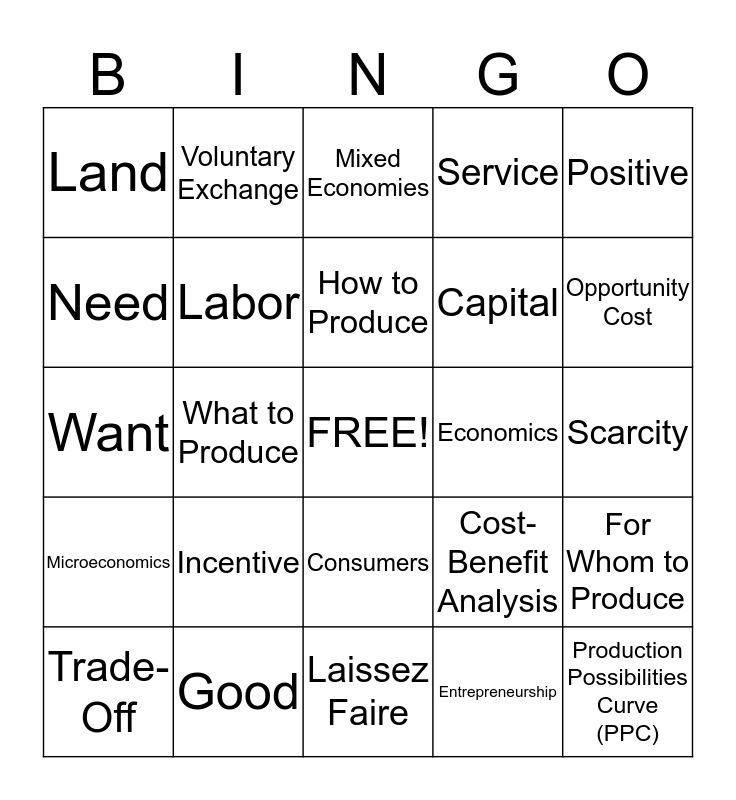 This bingo card has a free space and 40 words: Normative, Want, Macroeconomics, Labor, Good, Consumers, How to Produce, Adam Smith, Positive, Microeconomics, What to Produce, Service, Production Possibilities Curve (PPC), Scarcity, Economics, Incentive, Producers, Land, Marginal Benefit, Mixed Economies, For Whom to Produce, Entrepreneurship, Capital, Need, On the curve, Product Market, Inside the Curve, Making Choices, Marginal Cost, Outside the Curve, Maximizing Utility, Trade-Off, Utility, Cost-Benefit Analysis, Opportunity Cost, Laissez Faire, Market Specialization, Factor Market, Voluntary Exchange and Market.