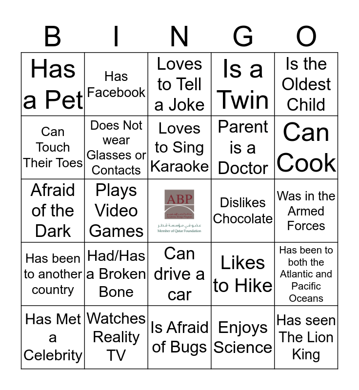 This bingo card has a free space and 24 words: Had/Has a Broken Bone, Watches Reality TV, Loves to Sing Karaoke, Has Met a Celebrity, Is the Oldest Child, Has a Pet, Can Touch Their Toes, Has Facebook, Dislikes Chocolate, Can drive a car, Parent is a Doctor, Afraid of the Dark, Likes to Hike, Has been to both the Atlantic and Pacific Oceans, Does Not wear Glasses or Contacts, Enjoys Science, Was in the Armed Forces, Loves to Tell a Joke, Can Cook, Plays Video Games, Has seen The Lion King, Has been to another country, Is a Twin and Is Afraid of Bugs.