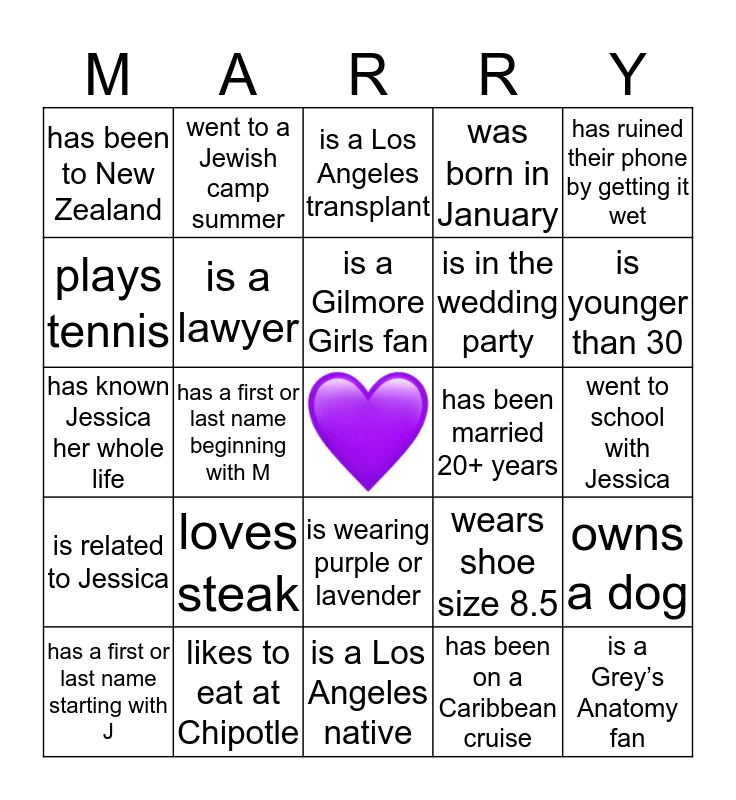 This bingo card has a free space and 24 words: loves steak, likes to eat at Chipotle, is a Gilmore Girls fan, has a first or last name starting with J, has ruined their phone by getting it wet, has been to New Zealand, plays tennis, went to a Jewish camp summer, has been married 20+ years, is wearing purple or lavender, is in the wedding party, has known Jessica her whole life, wears shoe size 8.5, owns a dog, is a lawyer, has been on a Caribbean cruise, went to school with Jessica, is a Los Angeles transplant, is younger than 30, has a first or last name beginning with M, is a Grey’s Anatomy fan, is related to Jessica, was born in January and is a Los Angeles native.