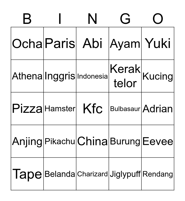 This bingo card has a free space and 24 words: Pikachu, Belanda, Indonesia, Tape, Yuki, Ocha, Athena, Paris, Bulbasaur, China, Kerak telor, Pizza, Burung, Eevee, Inggris, Jiglypuff, Adrian, Abi, Kucing, Hamster, Rendang, Anjing, Ayam and Charizard.