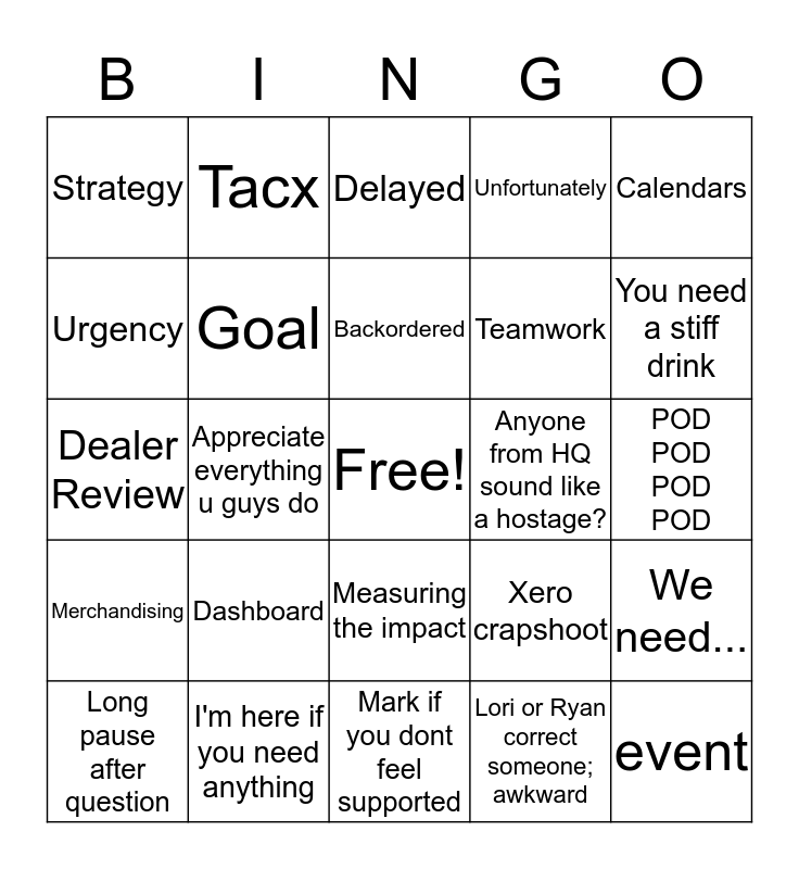 This bingo card has a free space and 29 words: Long pause after question, Success stories, Appreciate everything u guys do, Infiltration, Strategy, Delayed, Goal, Dashboard, Anyone from HQ sound like a hostage?, I'm here if you need anything, POD POD POD POD, event, Mark if you dont feel supported, Lori or Ryan correct someone; awkward, You need a stiff drink, We are somehow 30% up and down 17%, Measuring the impact, Merchandising, Calendars, Dealer Review, Xero crapshoot, Sales meeting, Teamwork, Urgency, Unfortunately, Tacx, We need..., Backordered and Still pending.